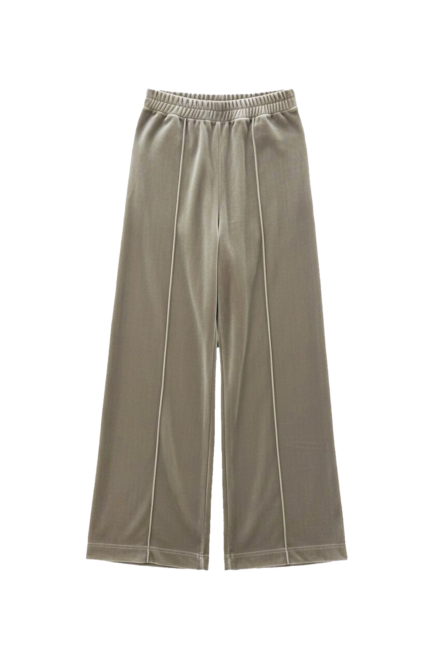 Mid rise velvet pant with an elastic waist and wide leg silhouette. Featuring distinctive fine top-stitching that adds structure to the fluid, wide leg cut.