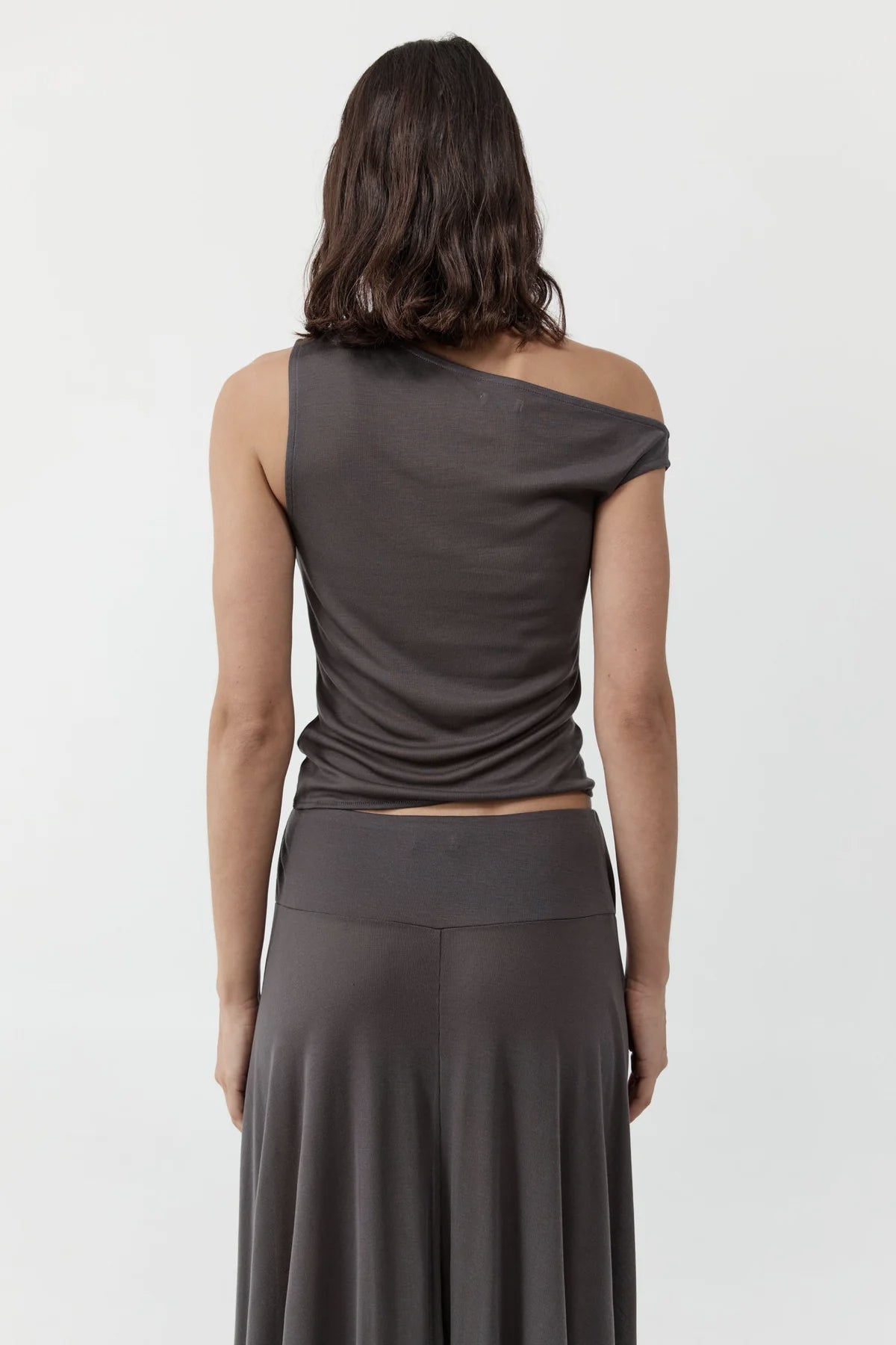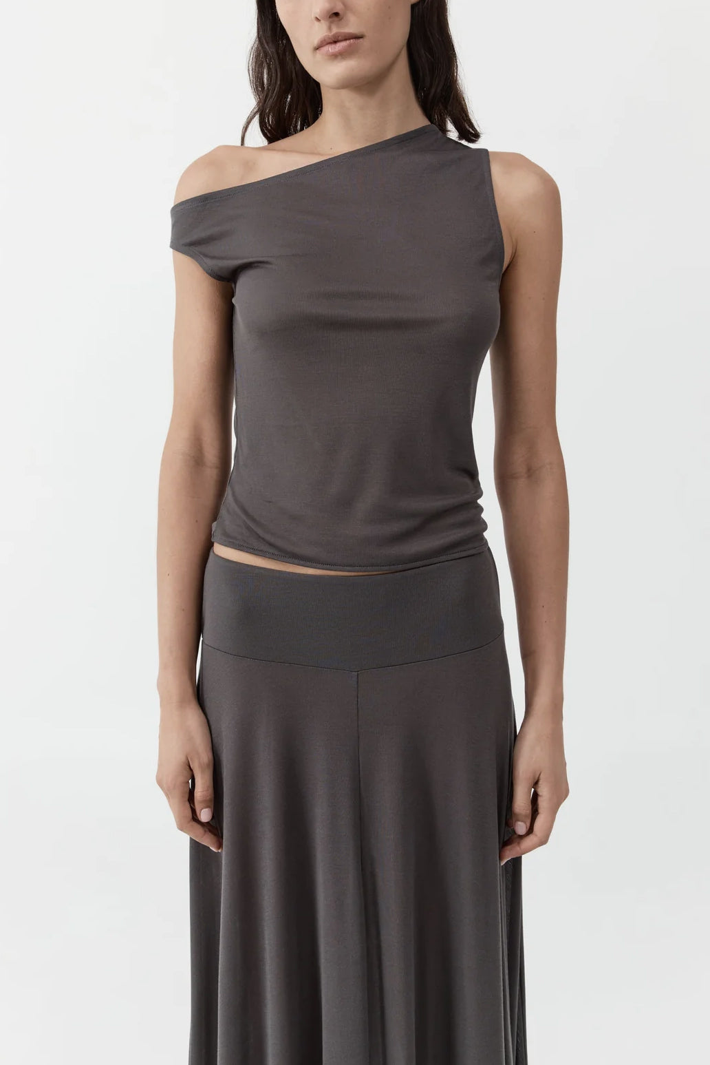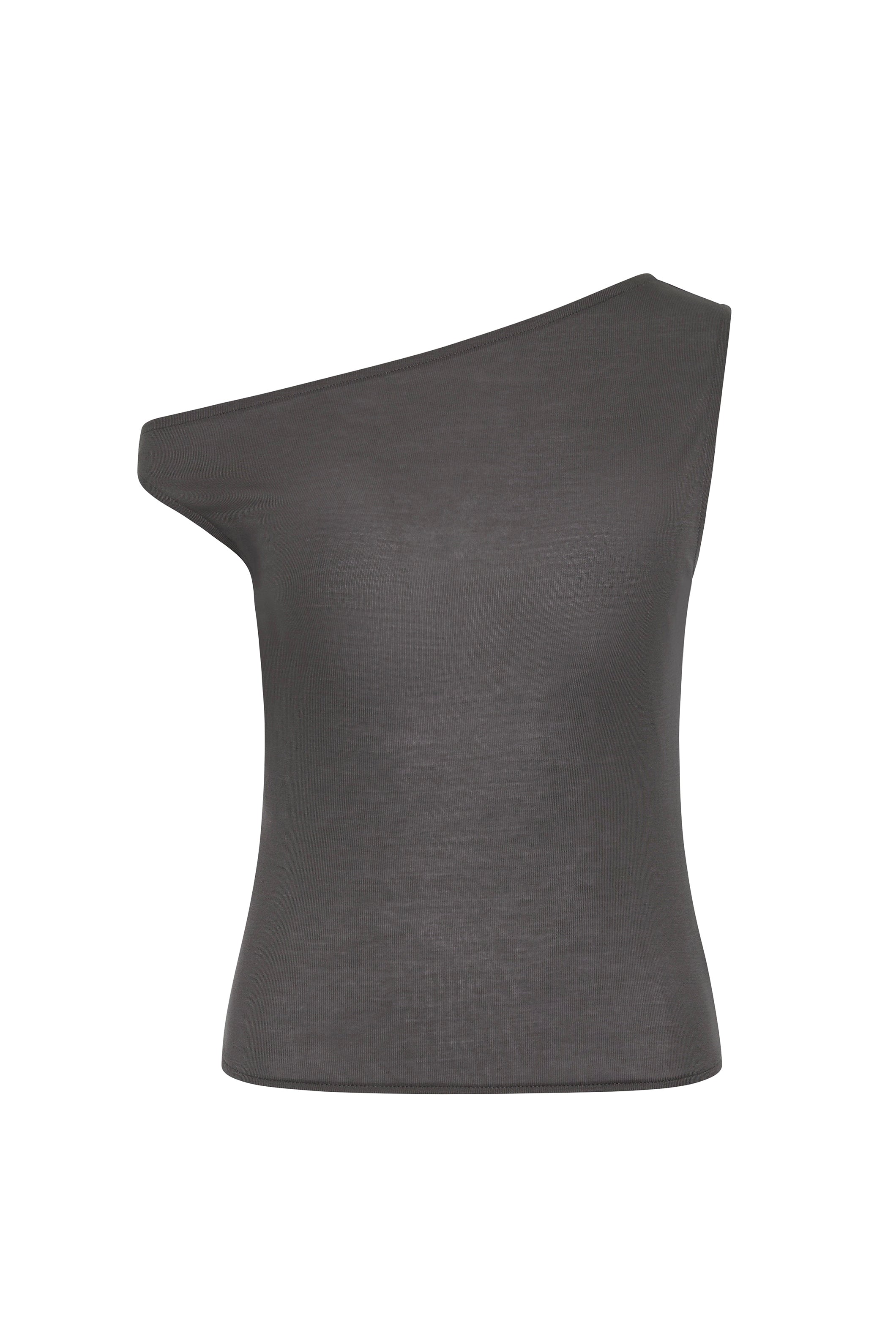 Asymmetric neckline and sleeves, waisted, center-front seam detail, slightly sheer.