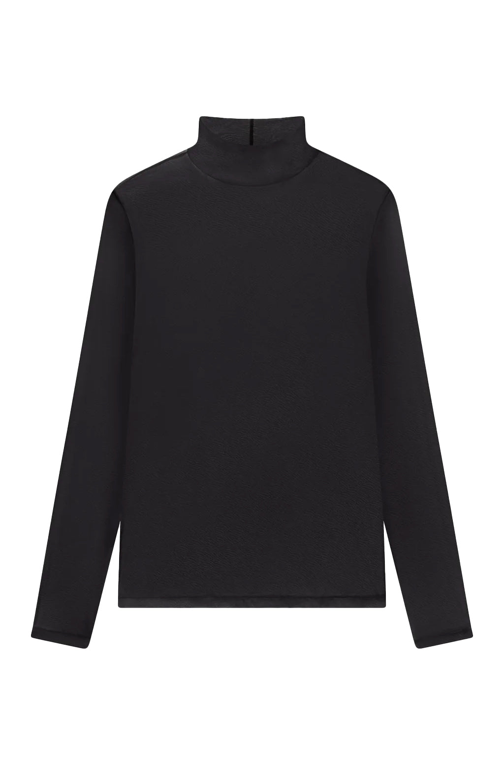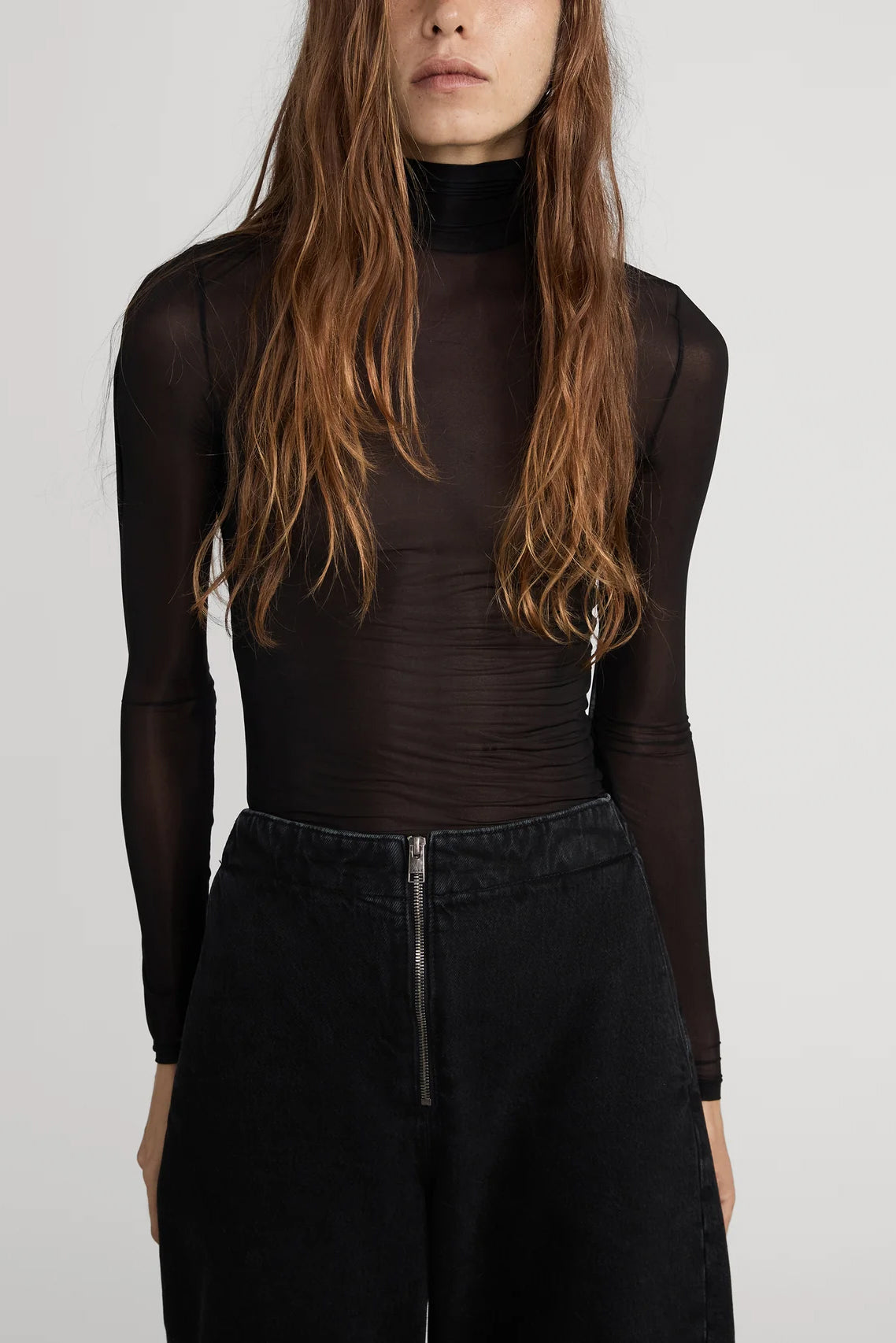 A play on the classic turtleneck, this lightweight, semi-sheer layer brings a cool textural element to any ensemble. Sexy on its own, The Hosiery Turtleneck also makes a polished layer under a sweater or blazer. Size down for a more sheer, fitted look.