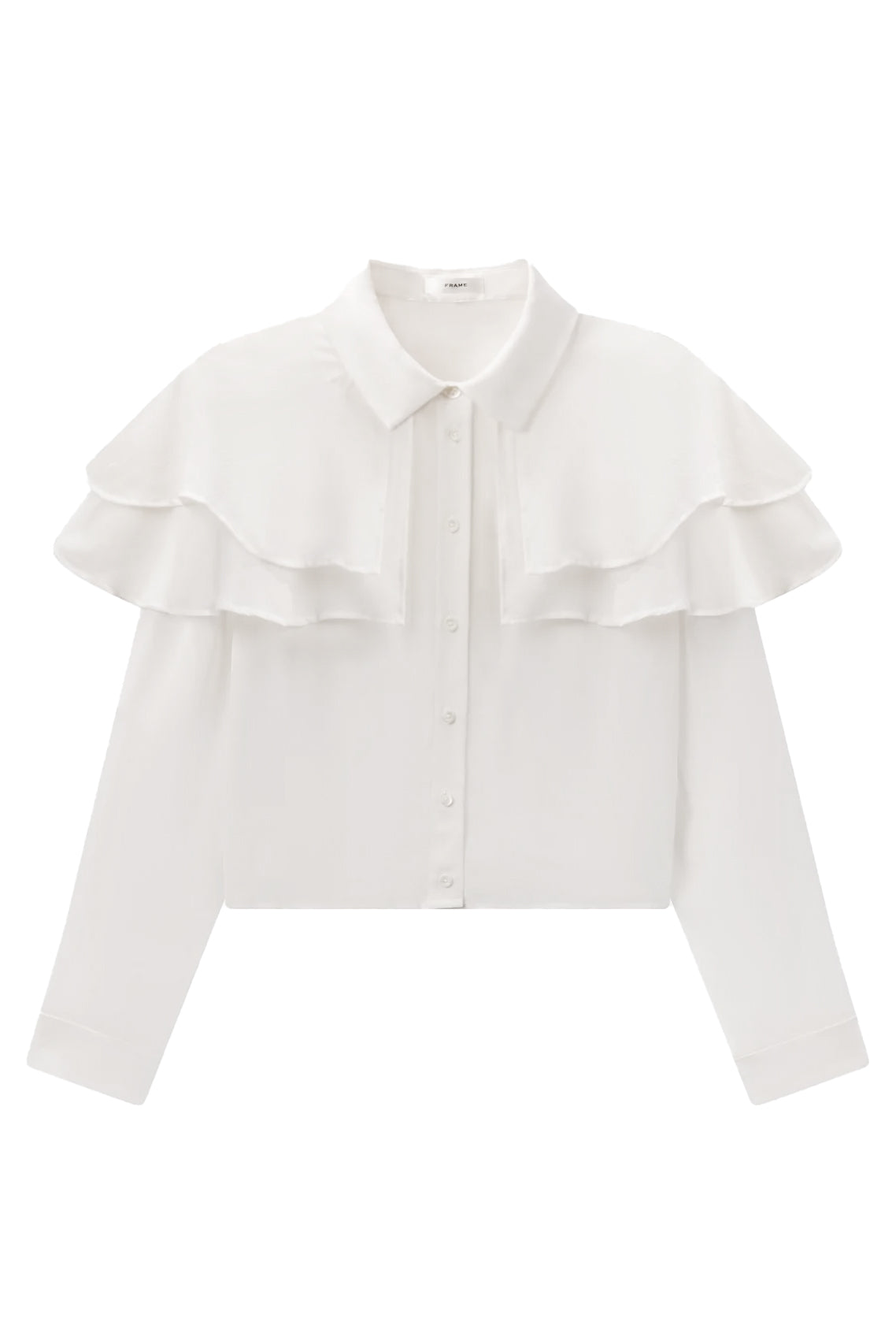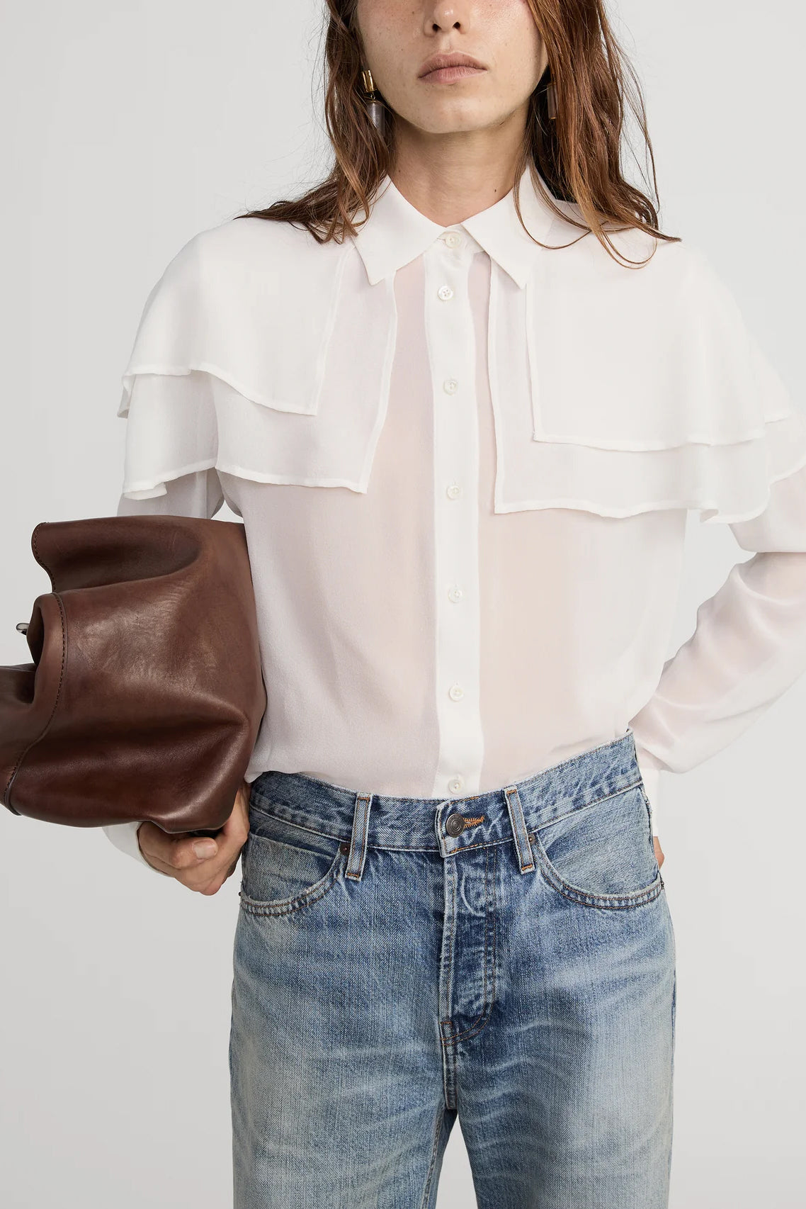 This semi-sheer silk blouse features a cape for layered dimension. In a classic cream hue, finished with front button closures.