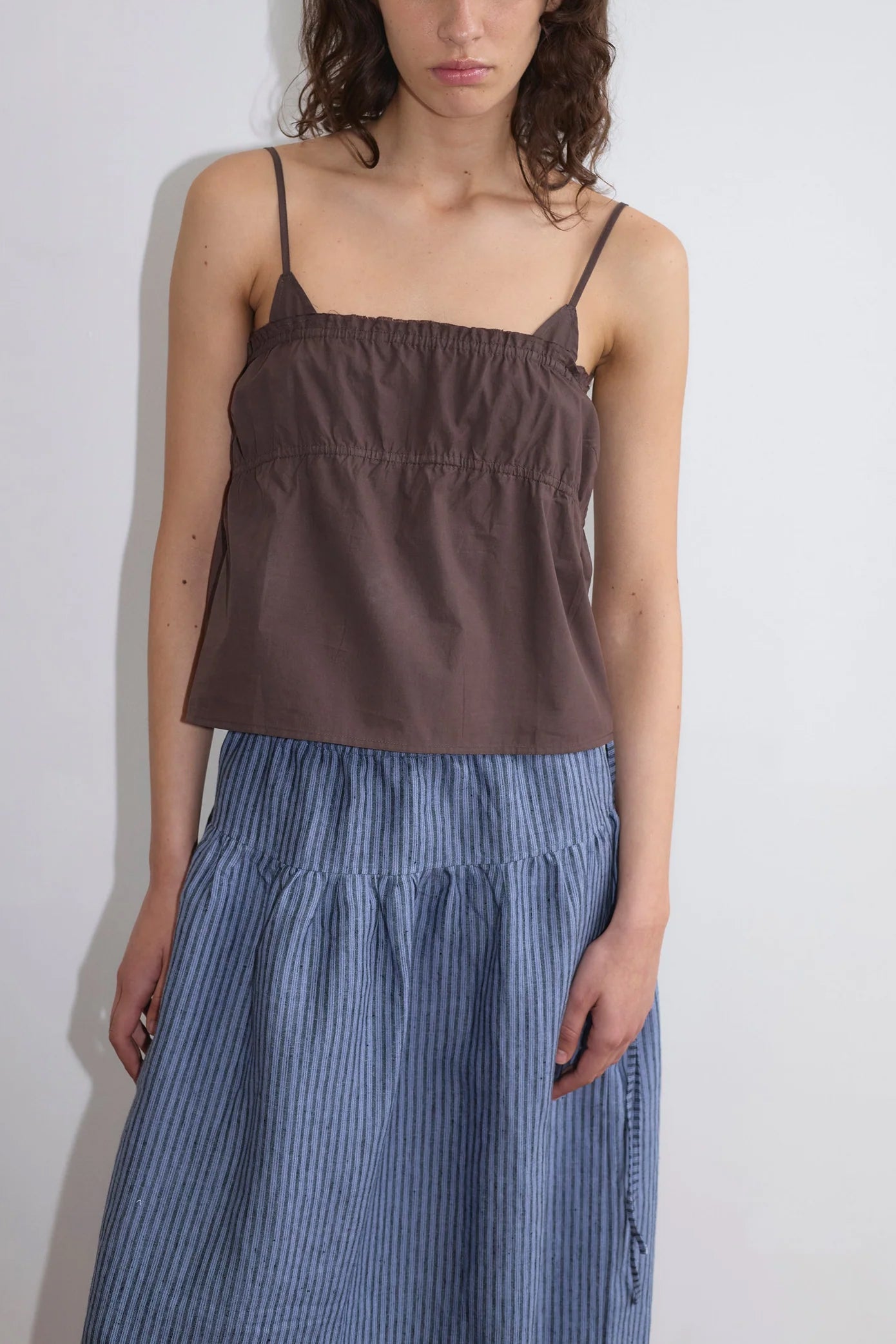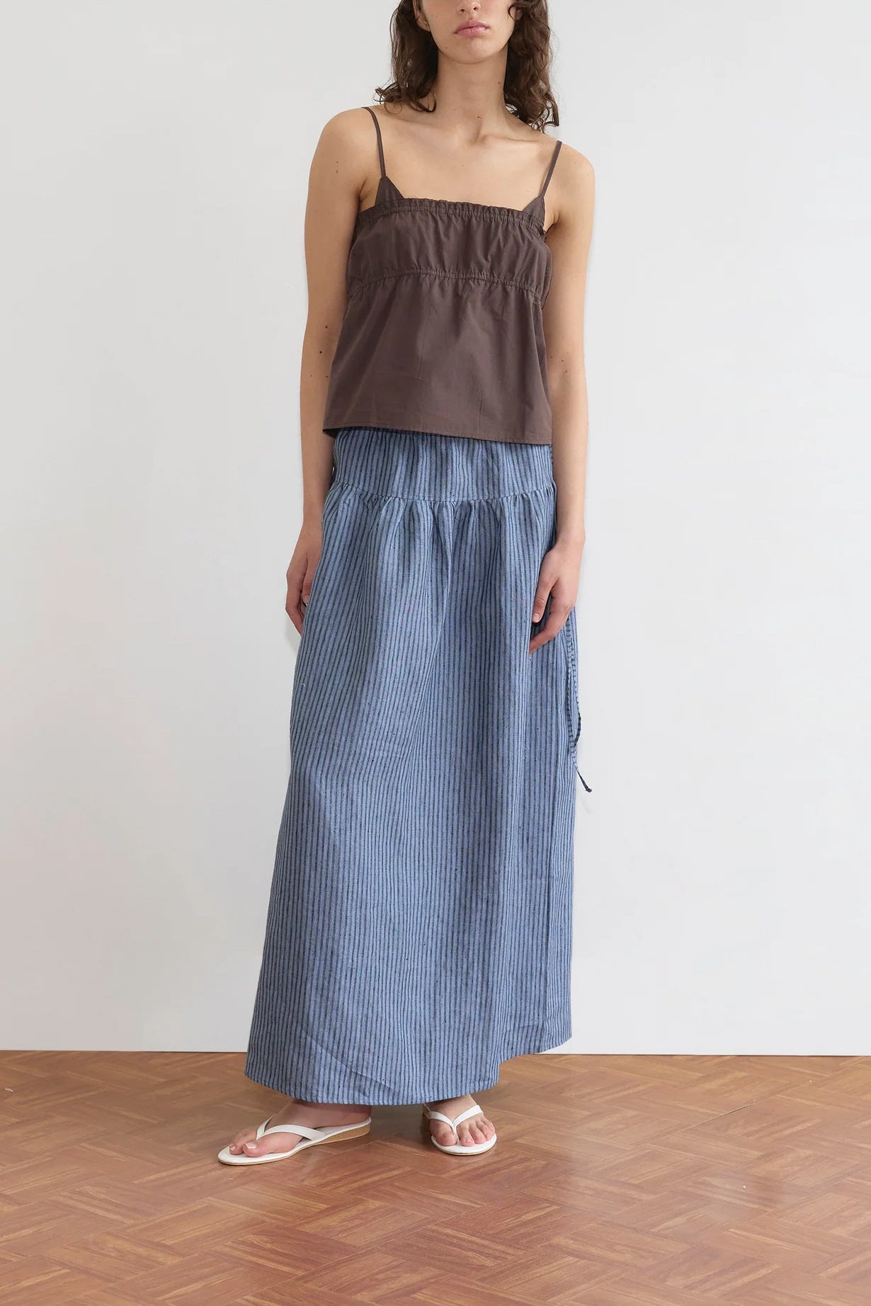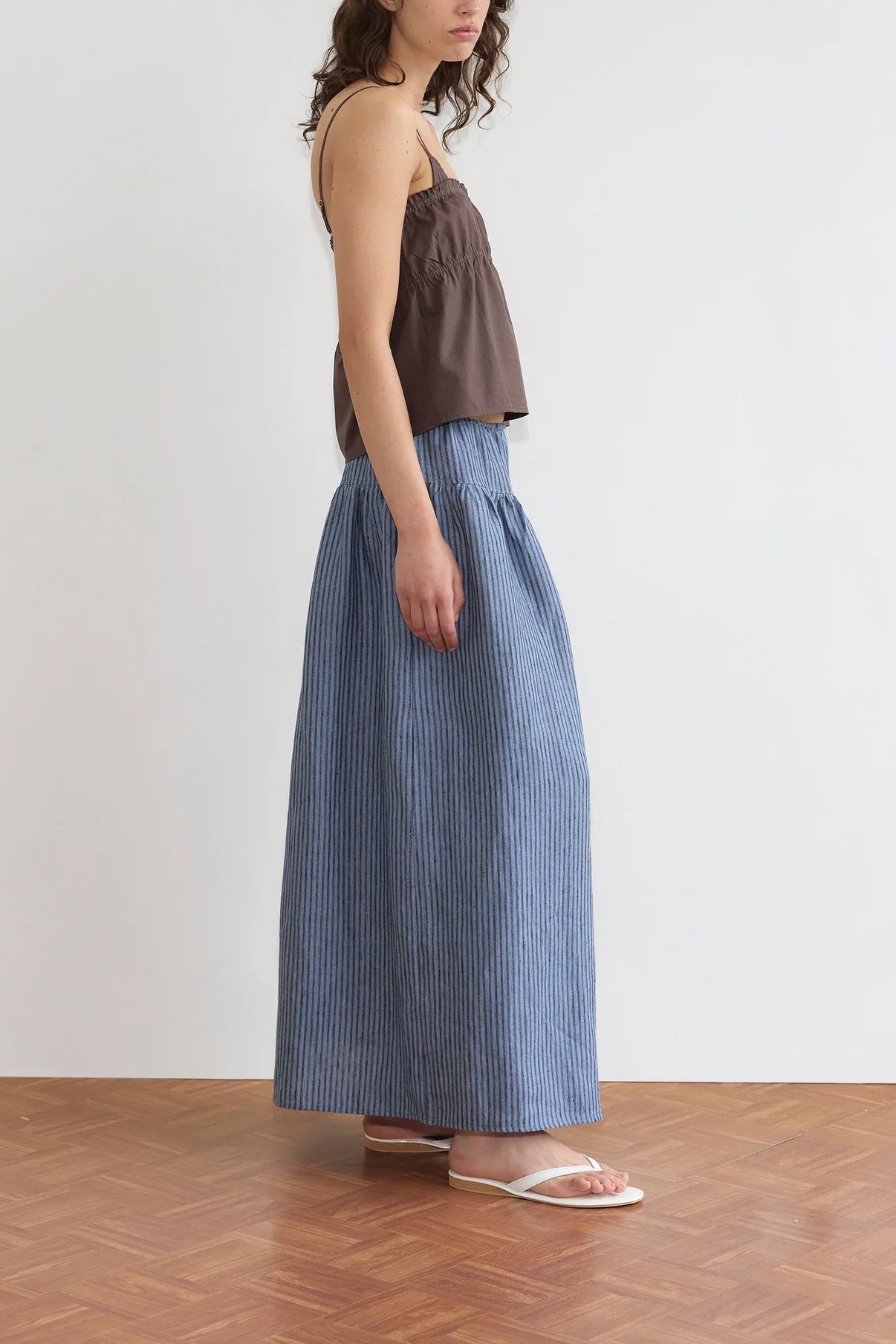 A maxi length skirt by Deiji Studios crafted from linen, designed with an elastic waist for comfort and versatility.
