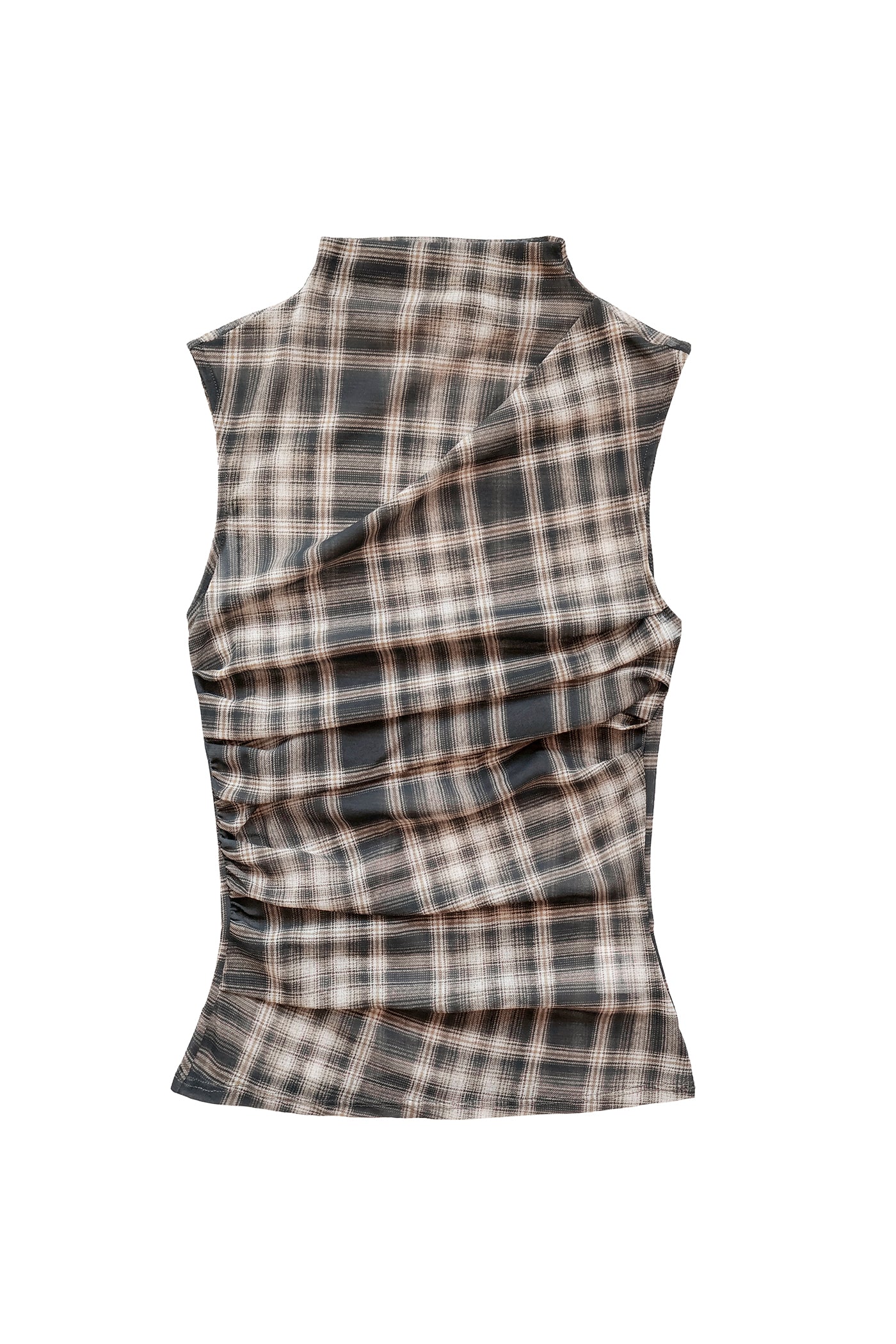 Sleeveless mock-neck top in semi-sheer stretch mesh with a draped silhouette