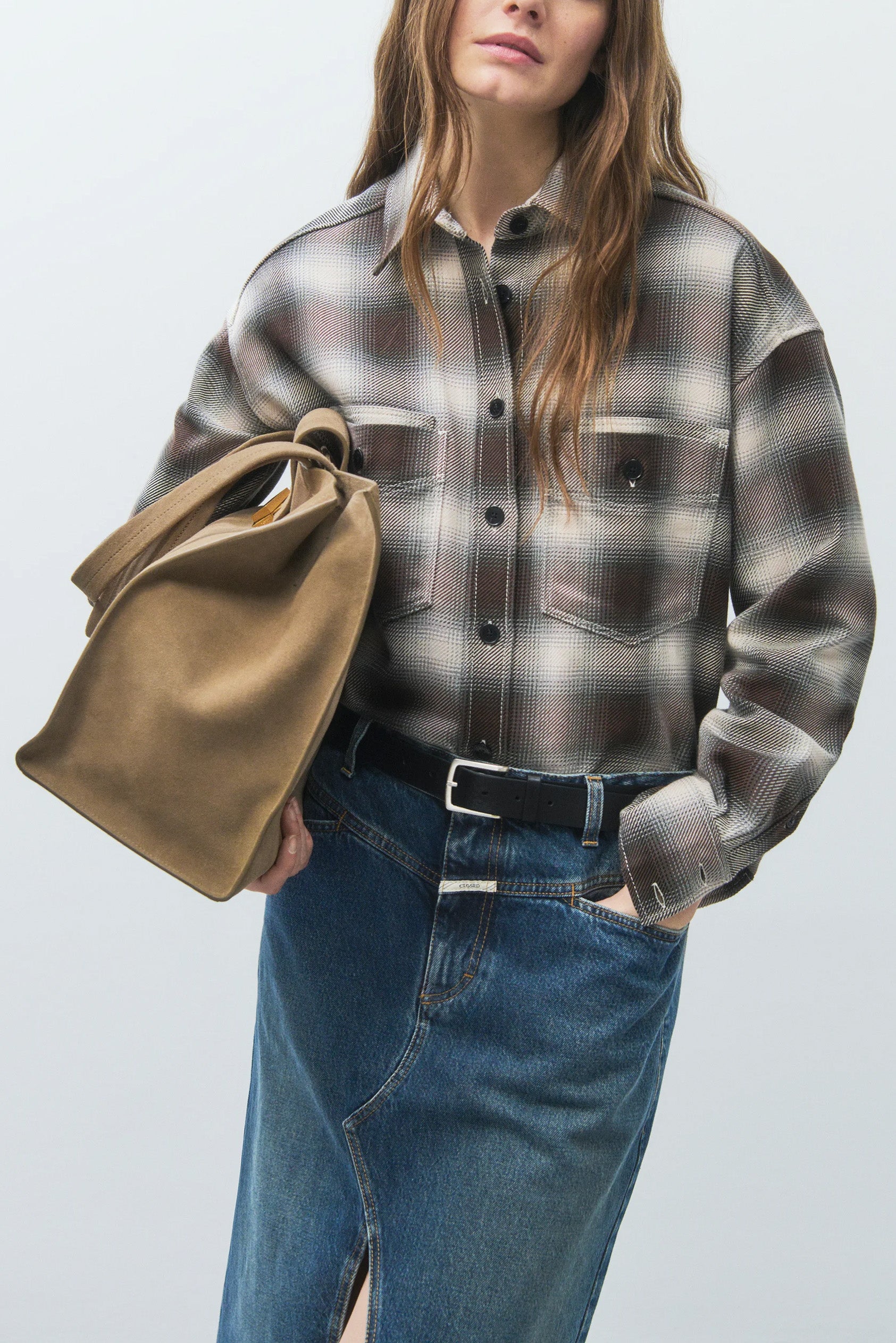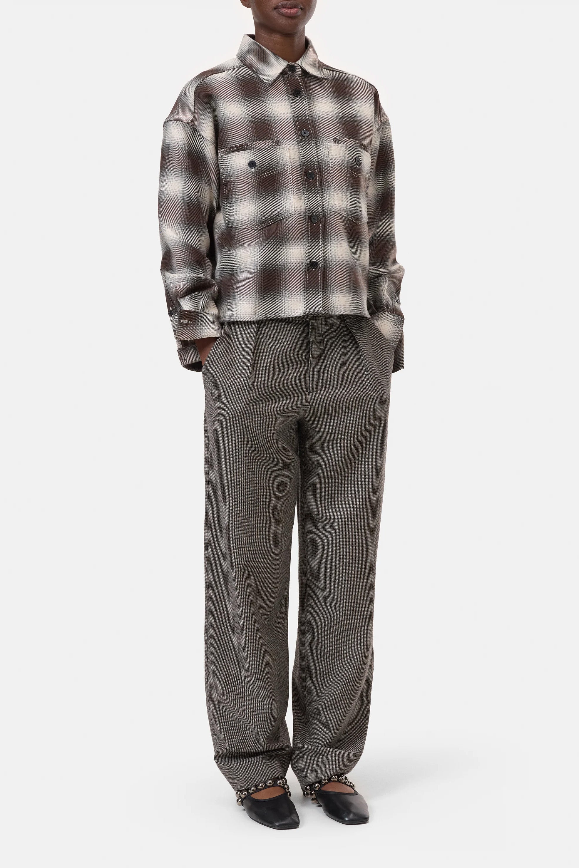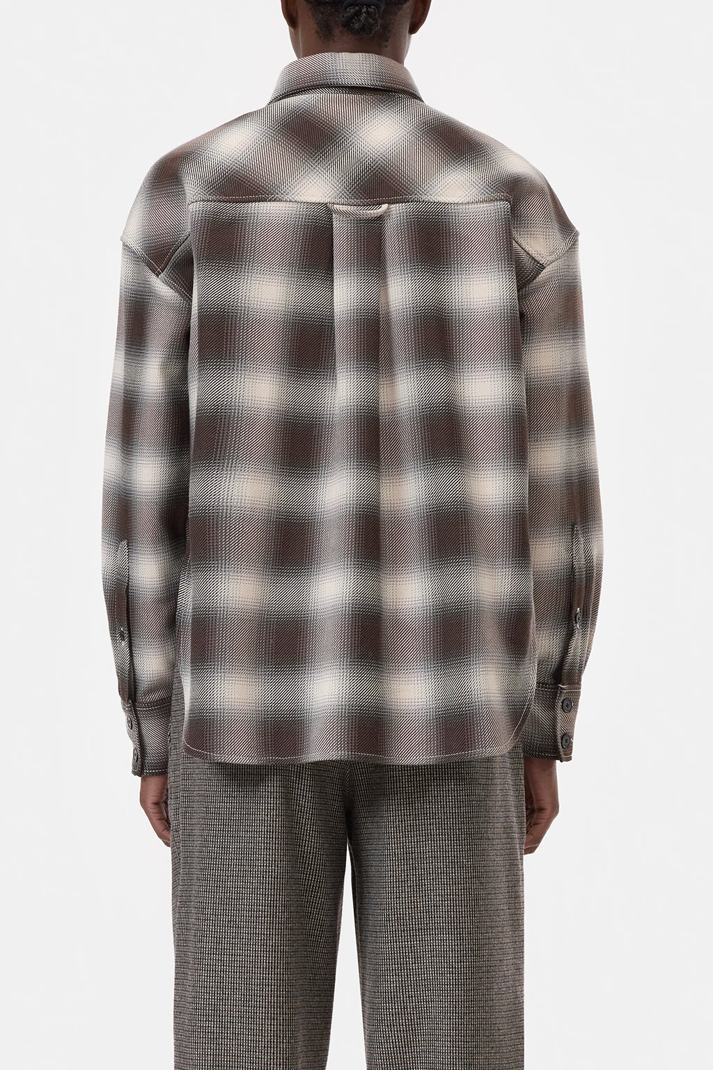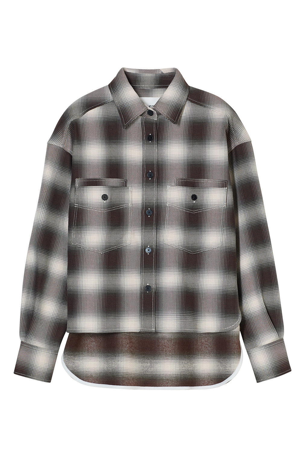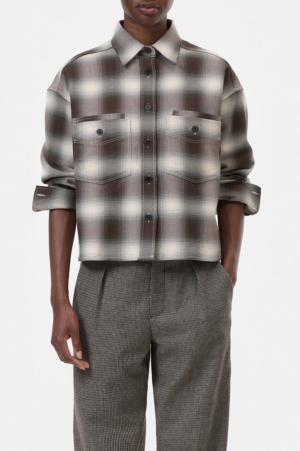This cropped oversized shirt features a shadow check pattern. Made of cotton with a brushed interior, it includes a curved high-low hem, mother-of-pearl chest pockets, a pointed collar, and drop shoulders. Crafted in Portugal.