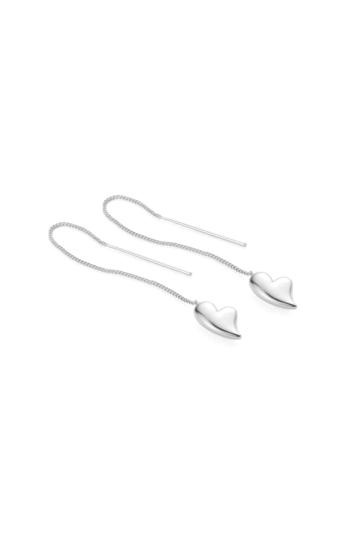 Tiny voluminous hearts are suspended on a barely-there chain, appearing like they're floating beneath your lobe. These versatile threader earrings can be looped into any piercing on your ear and adjusted to your preferred length. Finished in high-polish silver.