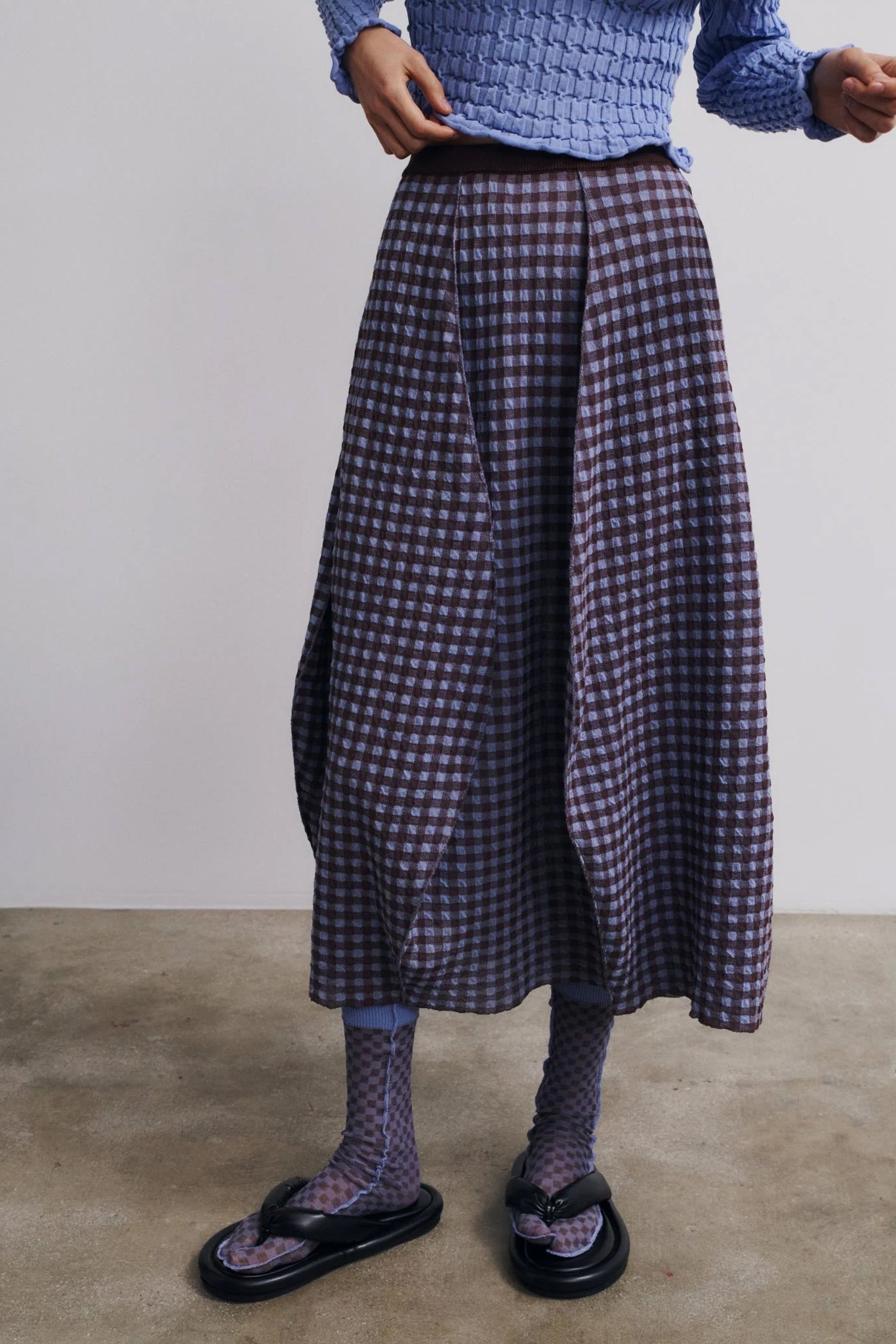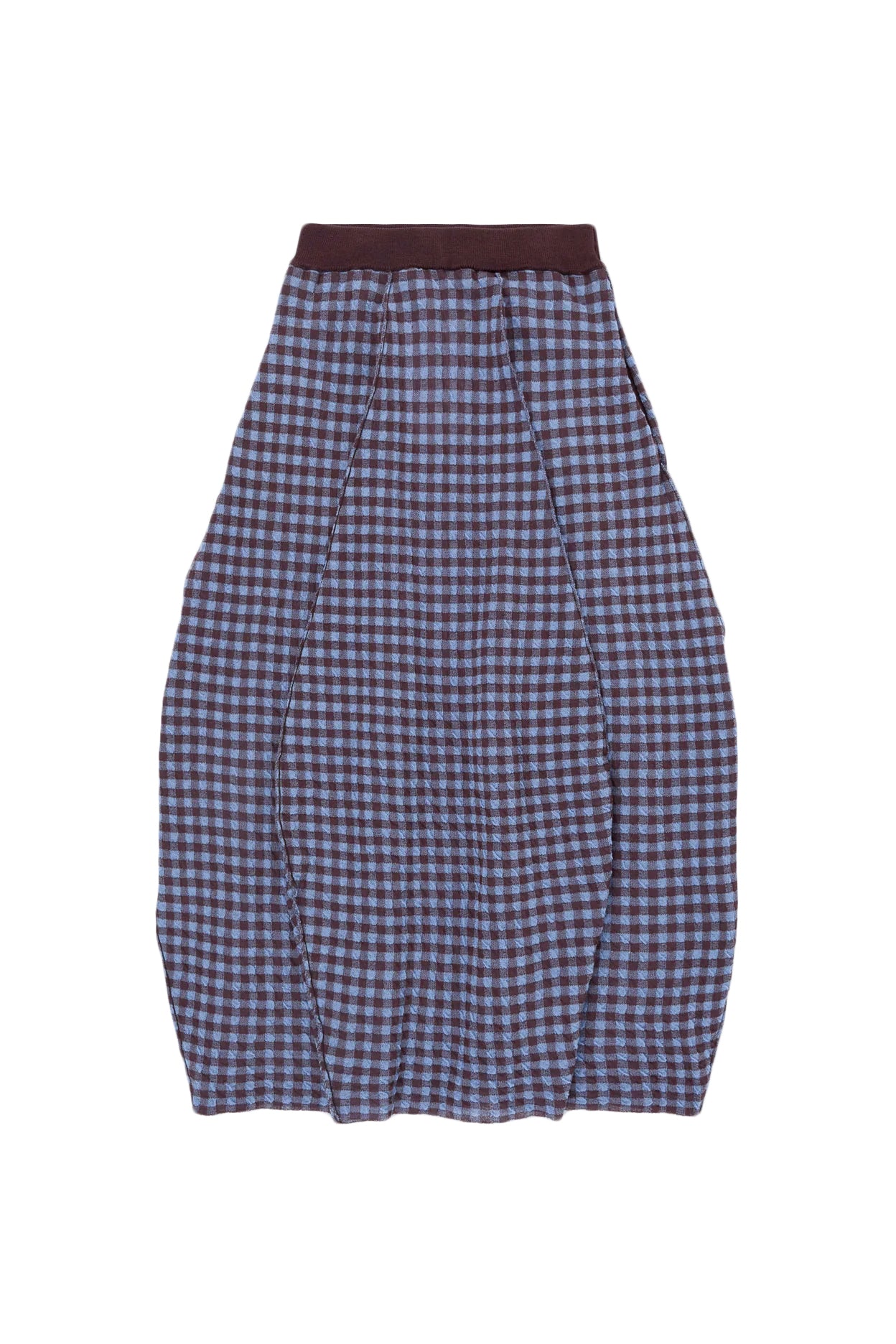 Lightweight midi skirt crafted from a textured cotton fabric. Rounded paneled structure.