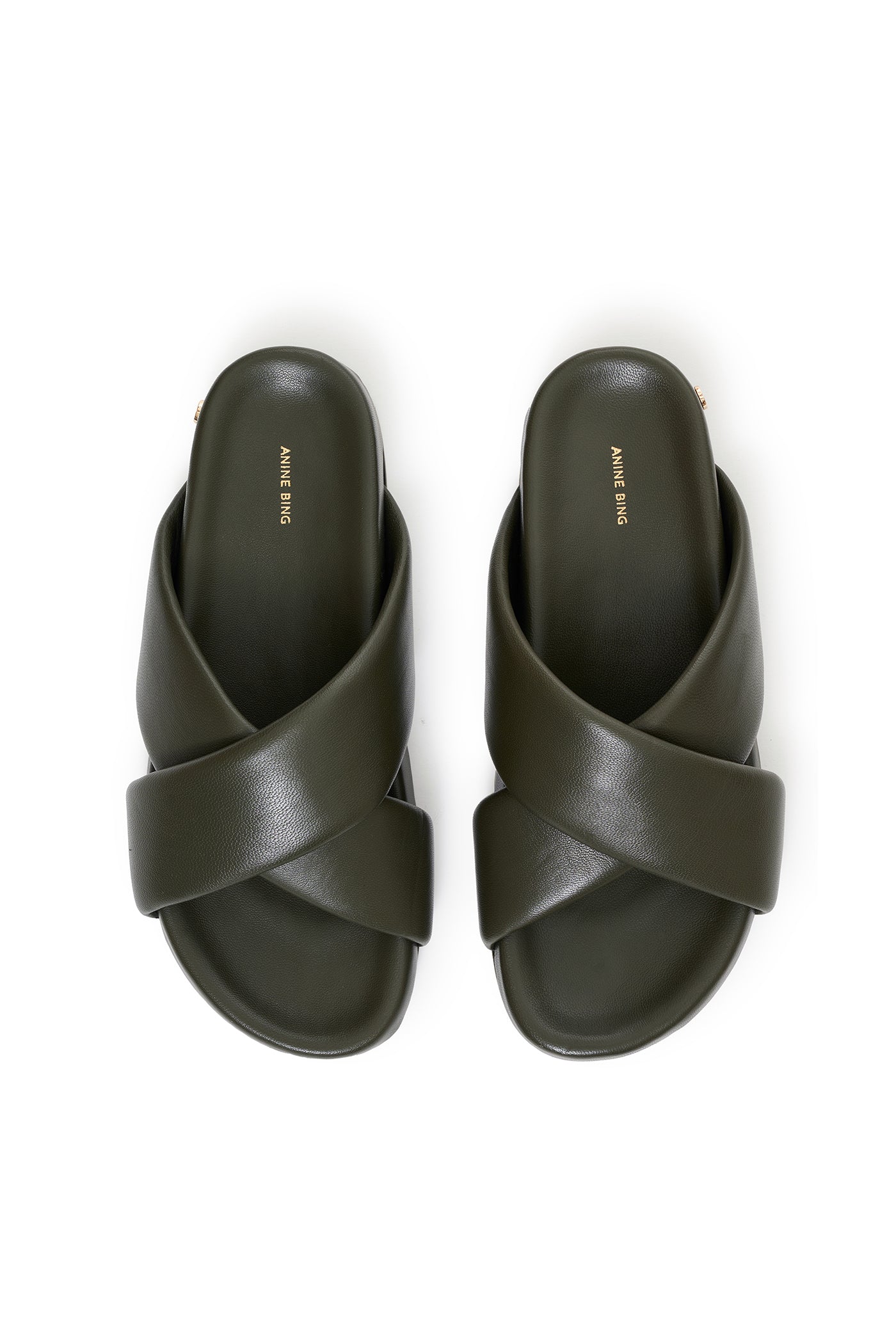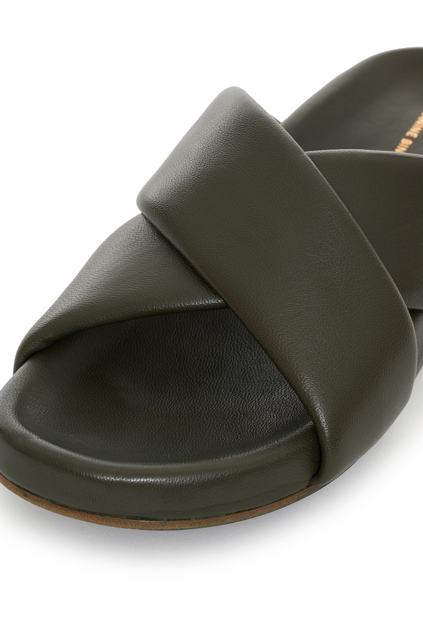 Sophisticated flat sandal constructed from smooth olive lambskin leather with padded cross-over straps