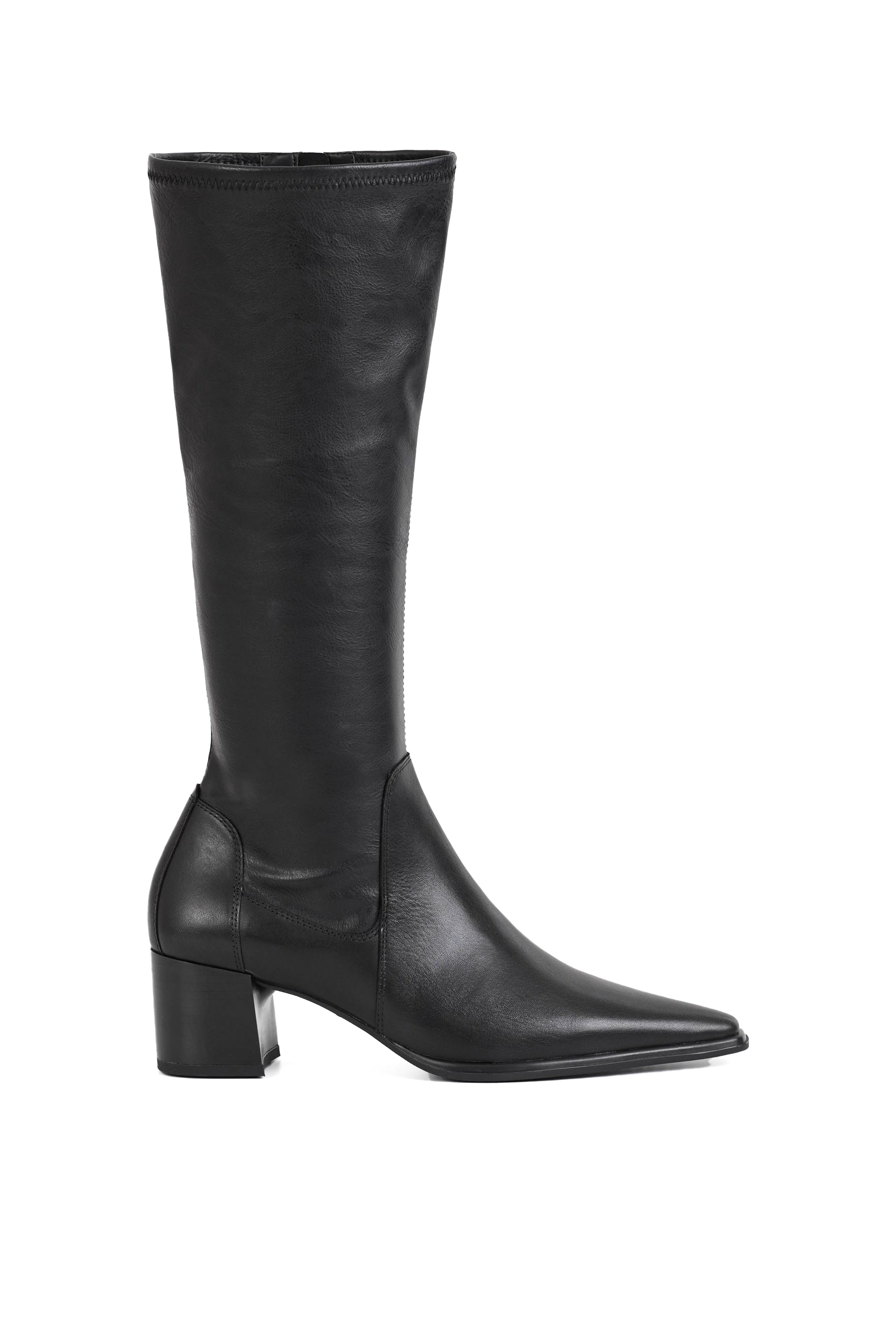 Giselle is the sophisticated tall boots with a stretchy silhouette, crafted from black leather and synthetic leather with a stretch shaft, zip-side fastening and pointed-toe shape.