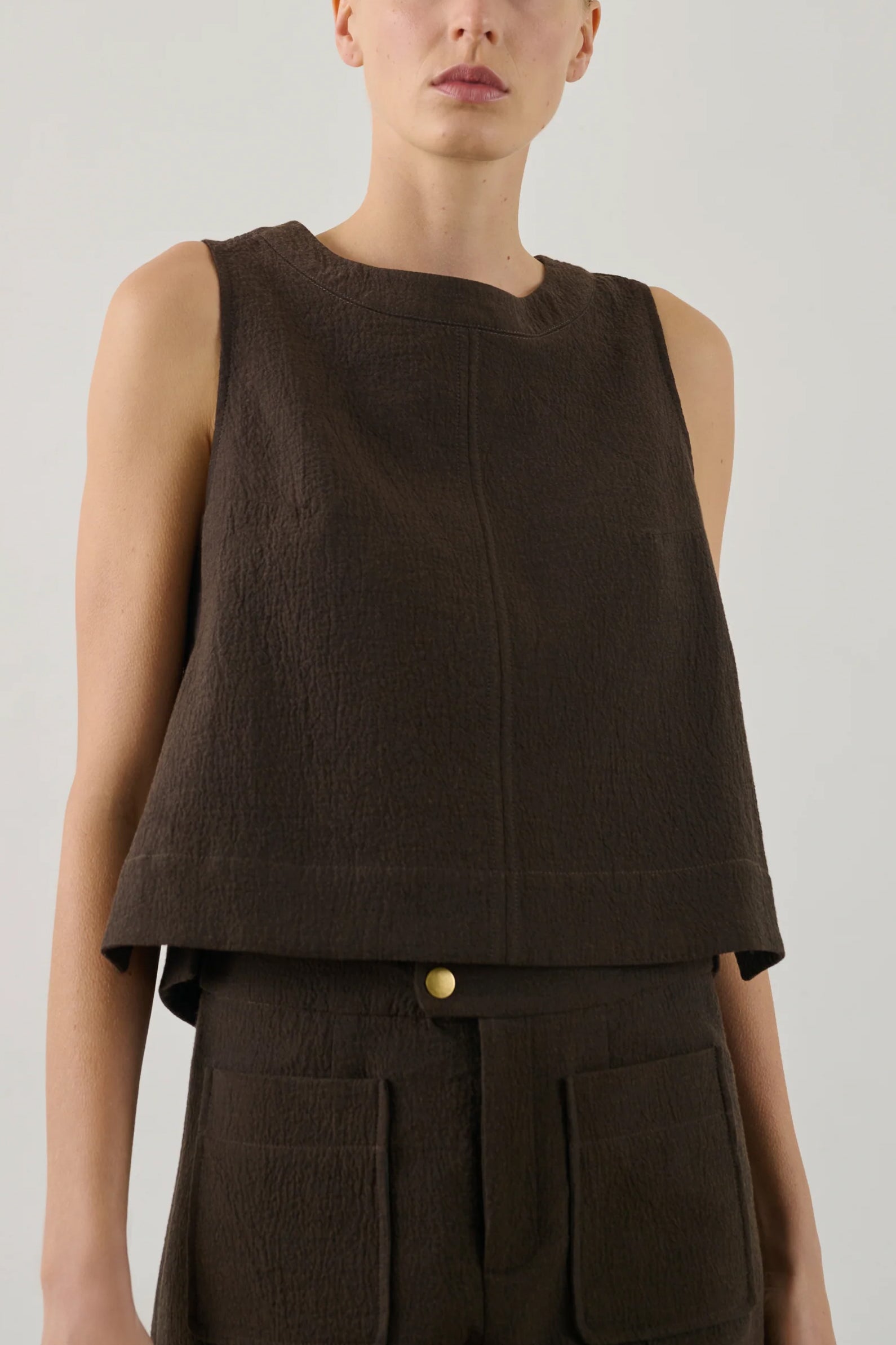 Slightly cropped with a rounded square neckline