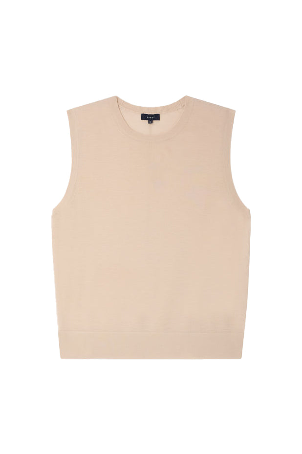 Sleeveless sweater vest with a crew neckline and slightly cropped silhouette. Can be worn alone or layered.