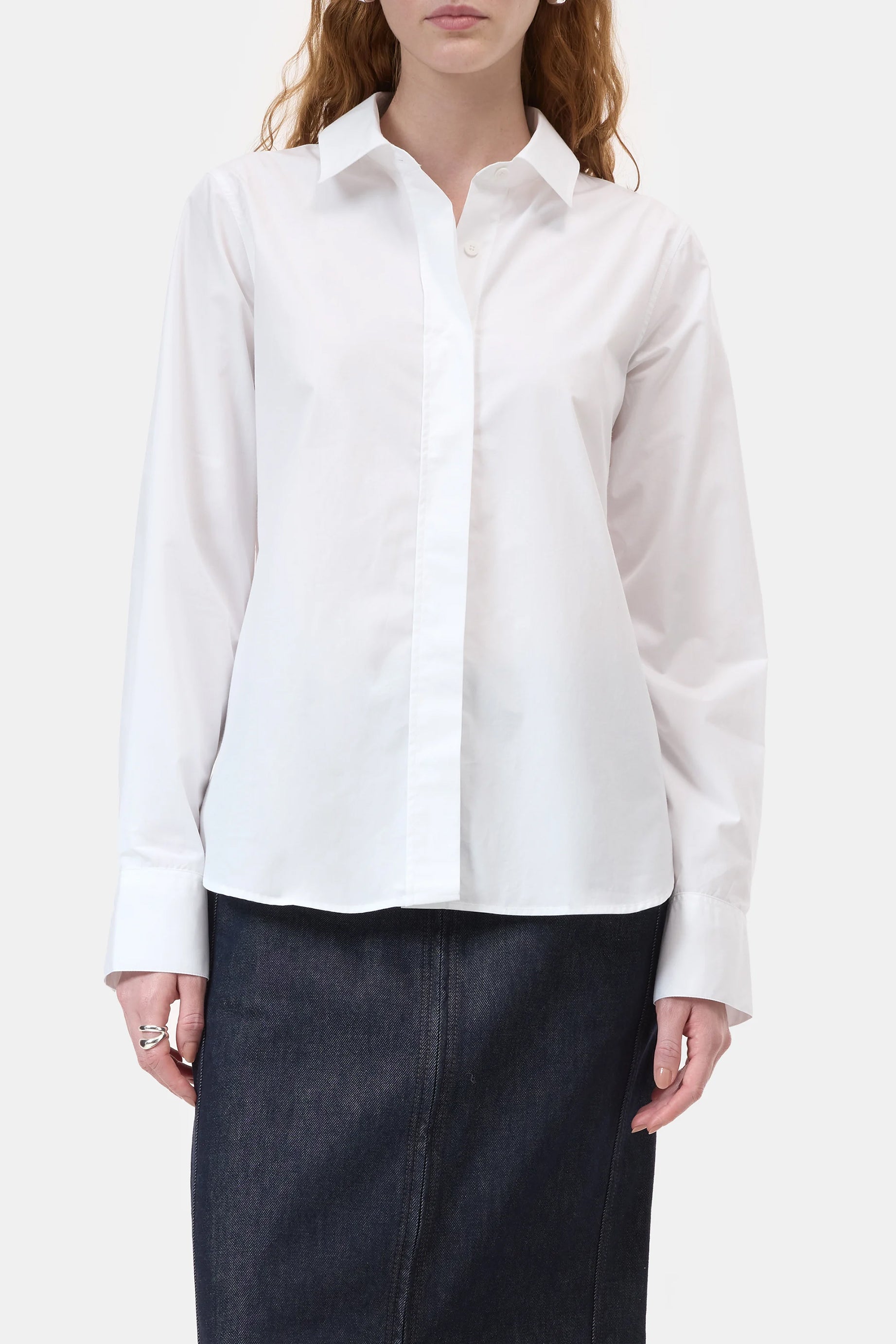 The compact poplin fabric with a papery feel is made entirely of organic cotton. This classic blouse comes in a regular fit. Characteristic features include a concealed button placket, a box pleat at the back, and tone-on-tone buttons. Made in Portugal.