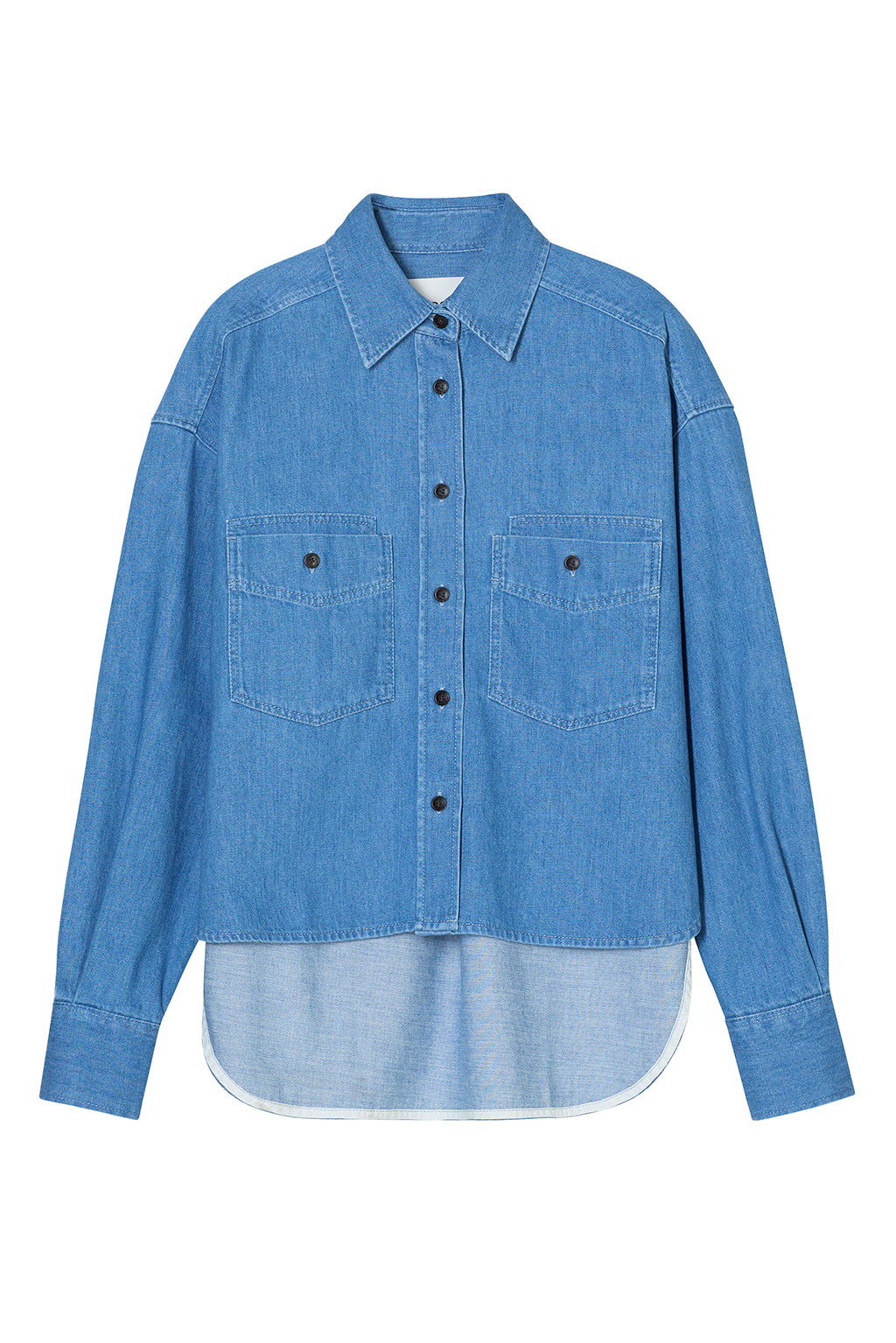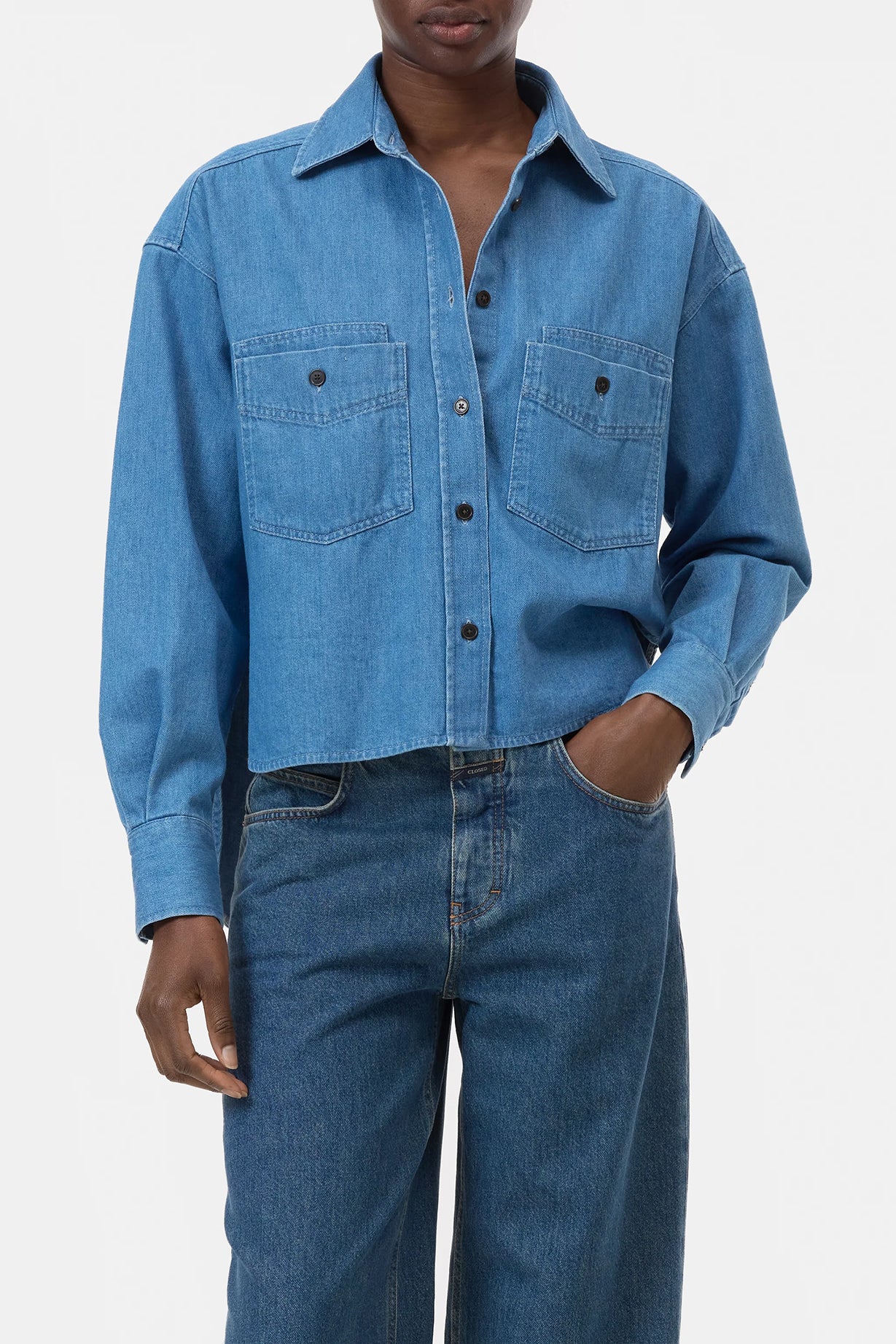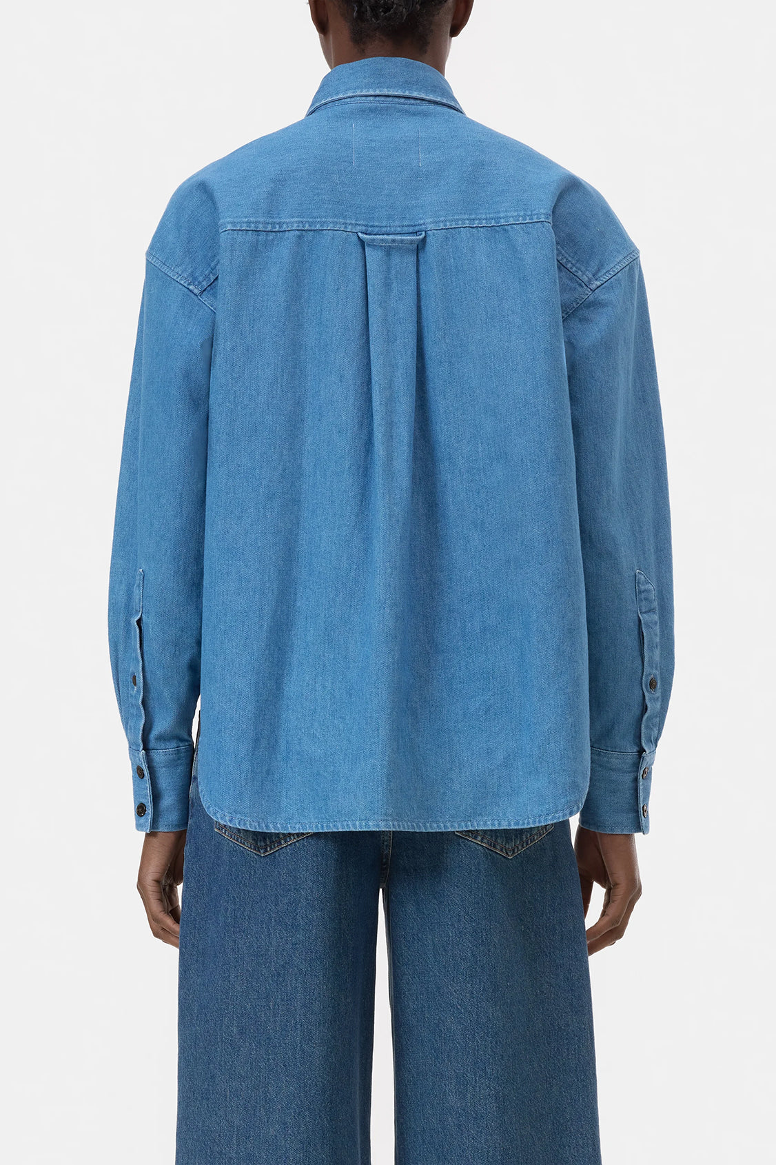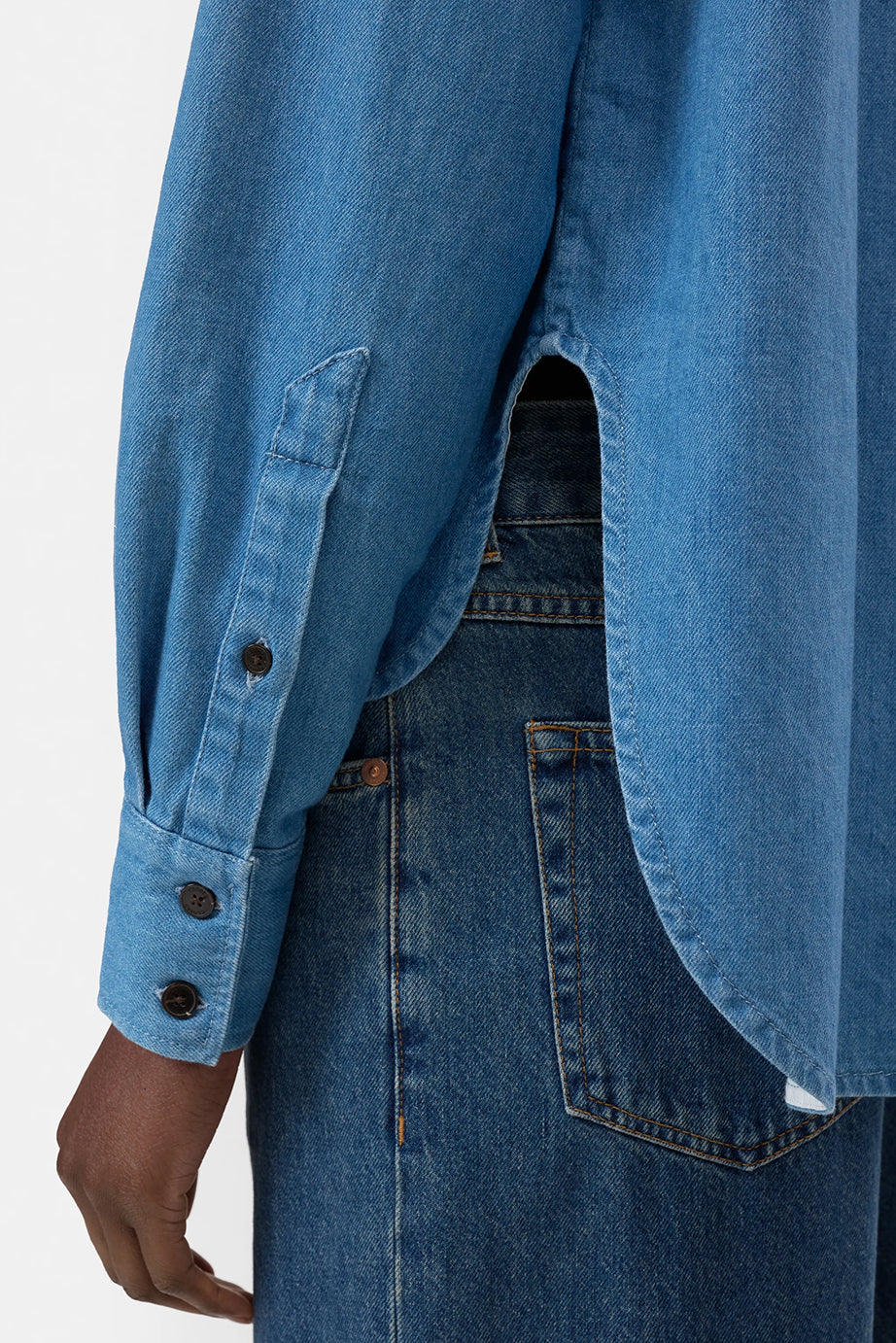 This lightweight, rigid denim shirt features a relaxed fit with a cropped front. It showcases a curved hem in the back, drop shoulders, heritage-inspired chest pockets with buttons, a pointed collar, our signature angled sleeve plackets, and a back yoke with a hanger loop. Made in Portugal.