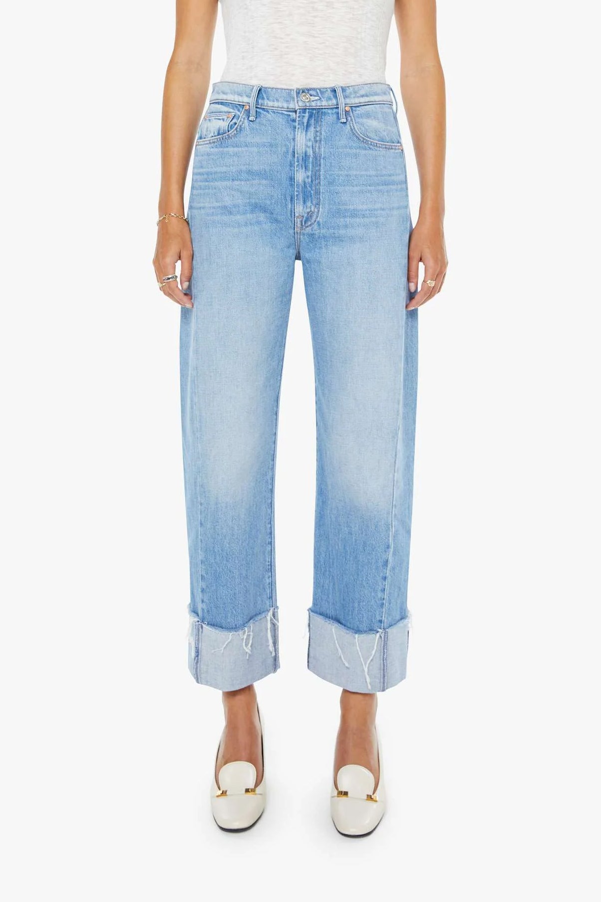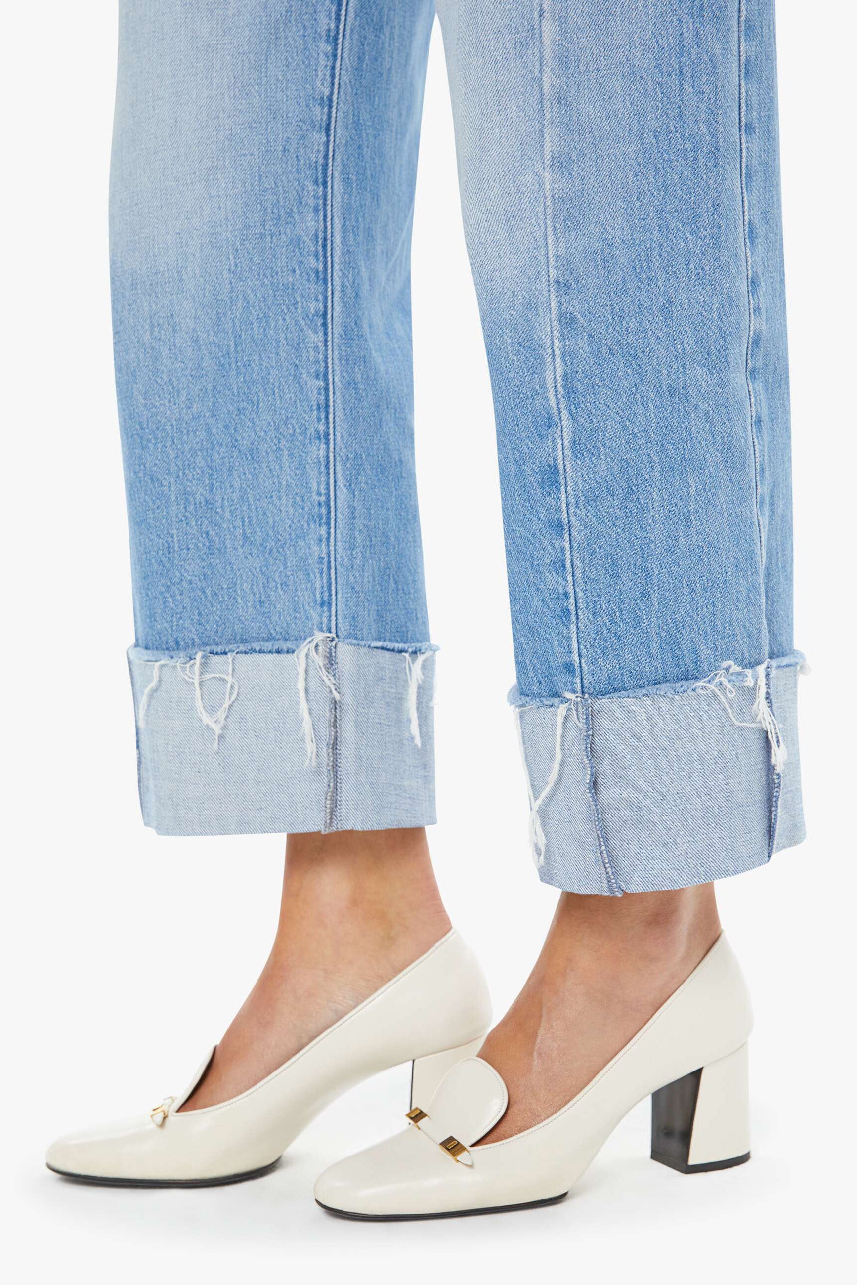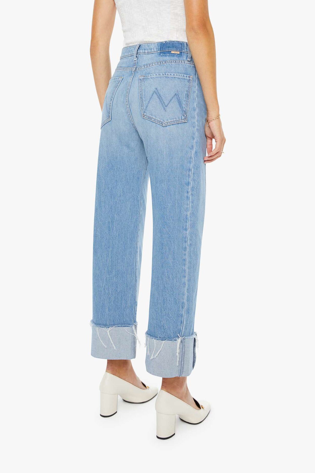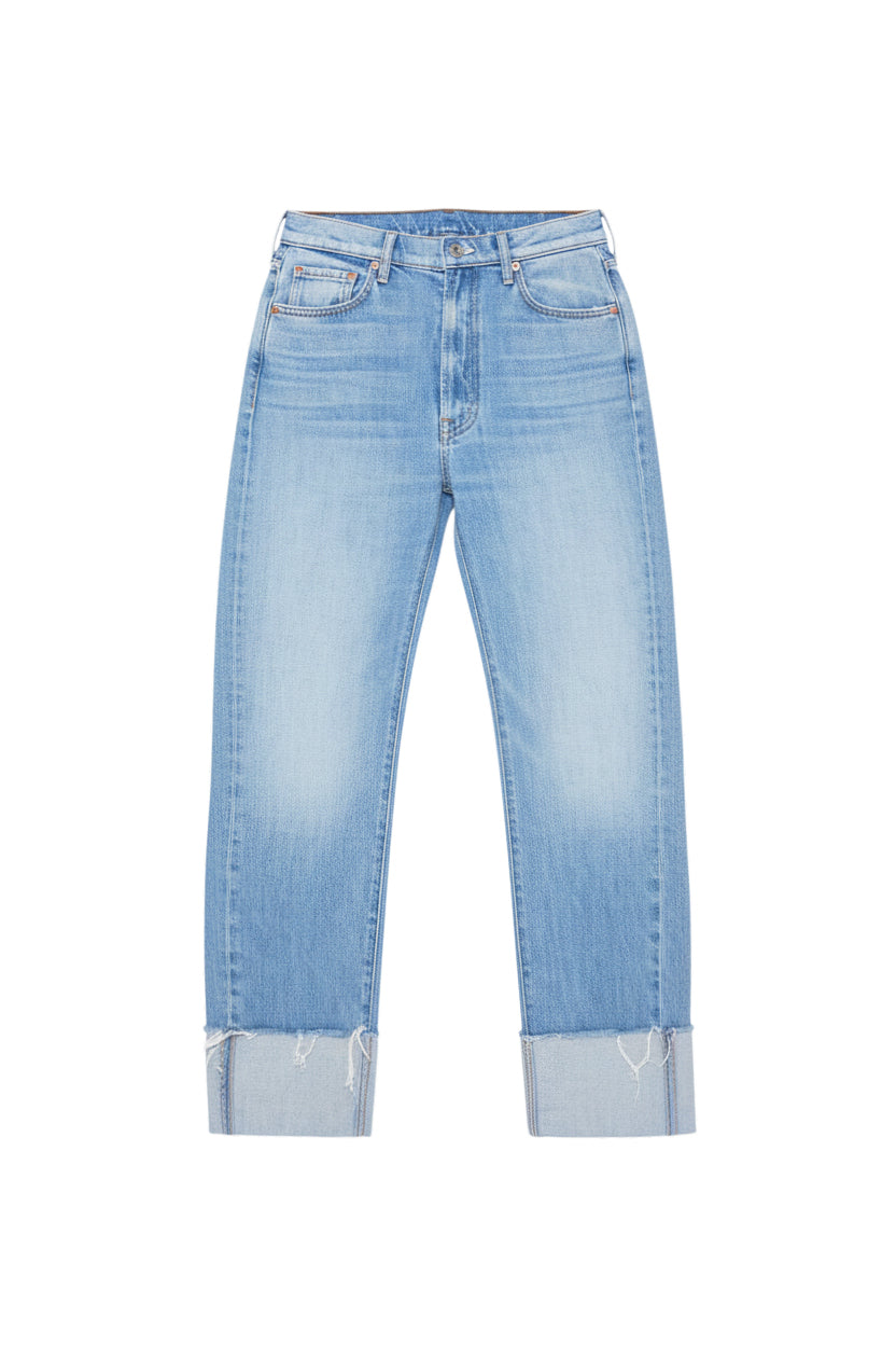 The Half Pipe Ankle Cuff Fray is a high-waisted barrel jean with a zip fly, wide and curved leg, and ankle length inseam with a cuffed, frayed hem. These jeans are semi-rigid and take time to break in.