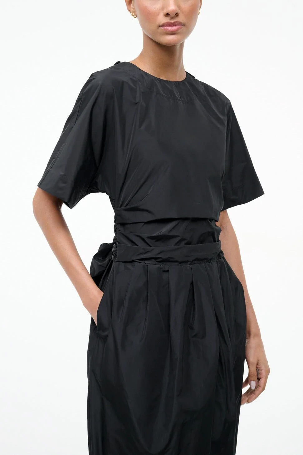An architectural short-sleeve dress crafted in nylon taffeta, the Michelina is the perfect versatile dress for any festive occasion. This style features a tulip skirt and gathering detail at the waist with bow tie in the back.
