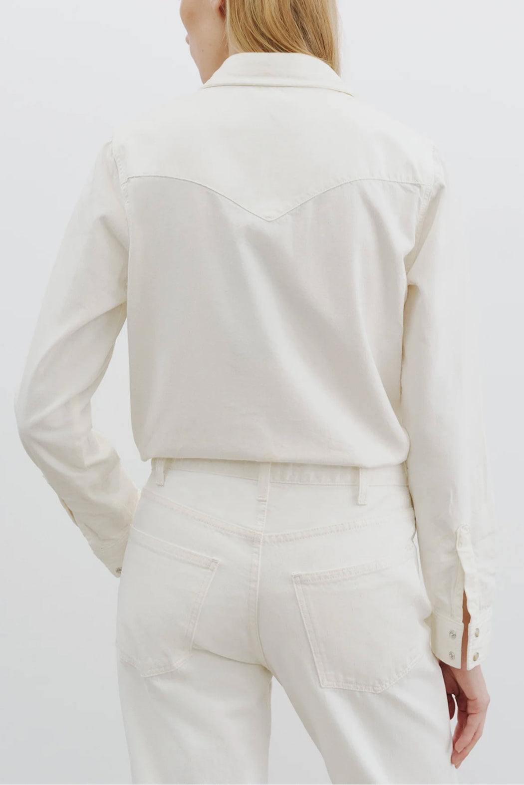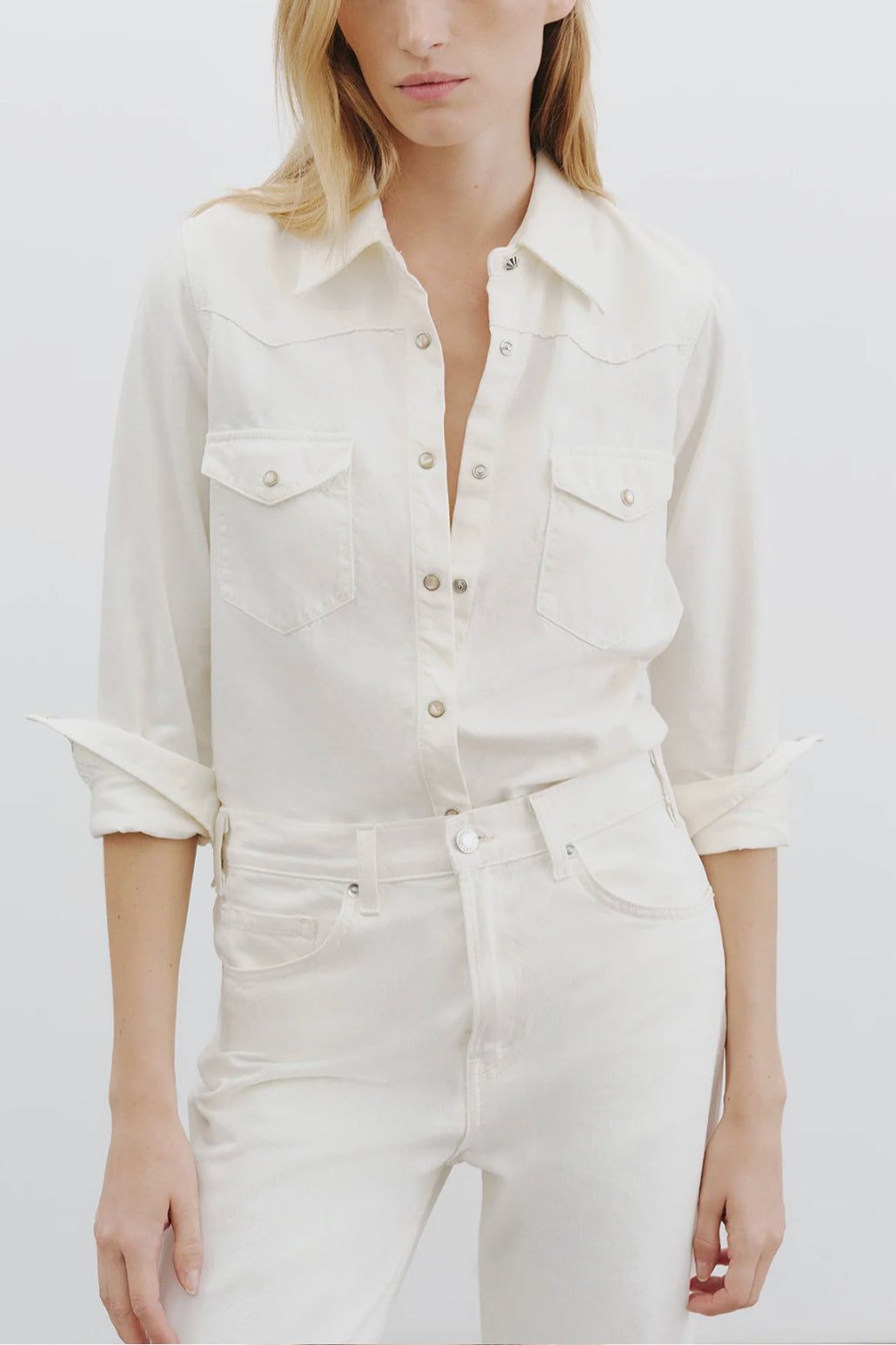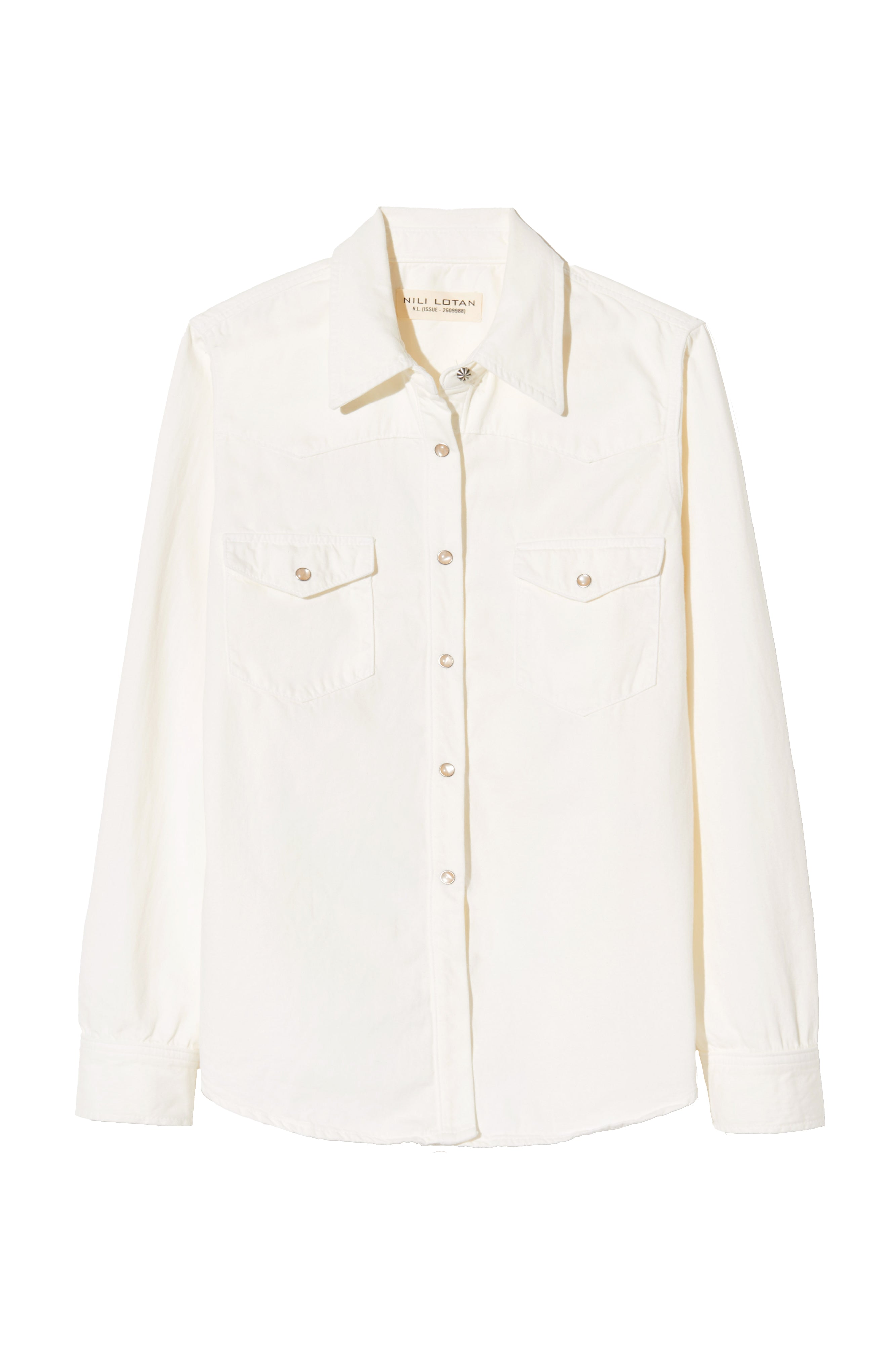 Classic, straight fit collared jean shirt in Japanese denim. Western details. Pearl snap buttons. Chest flap pockets. Standard placket. Center front buttons. Buttons at cuff.
